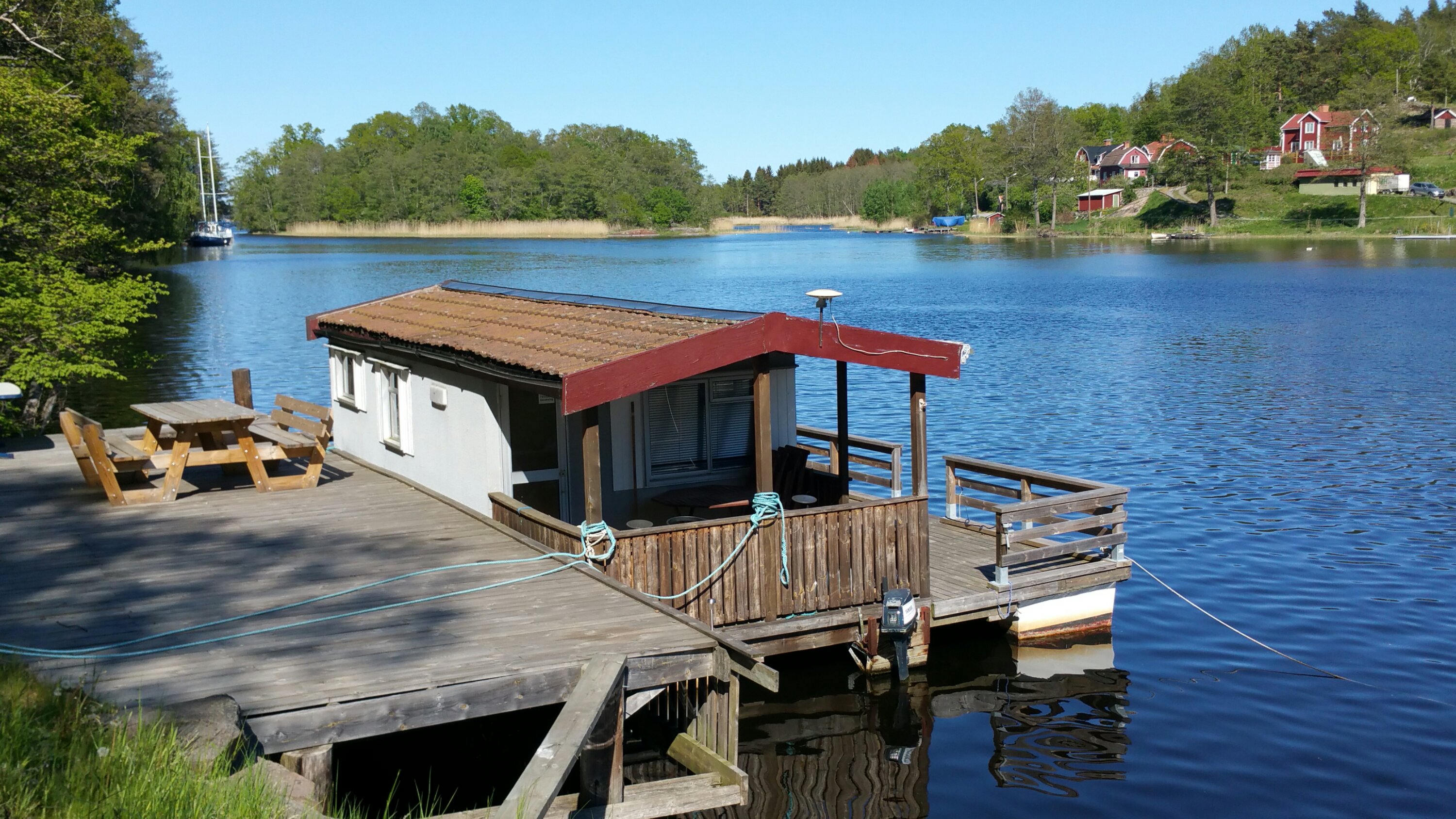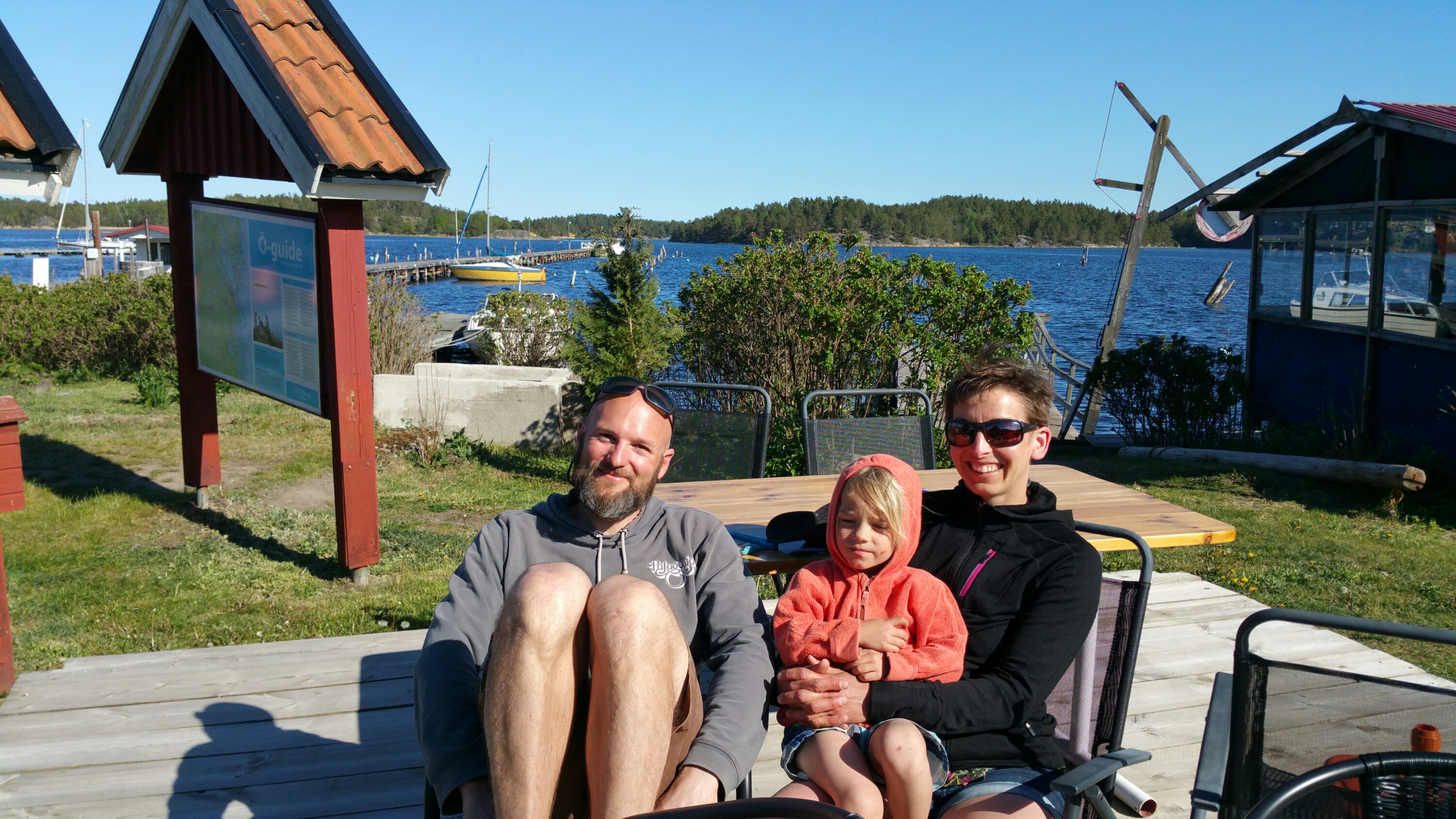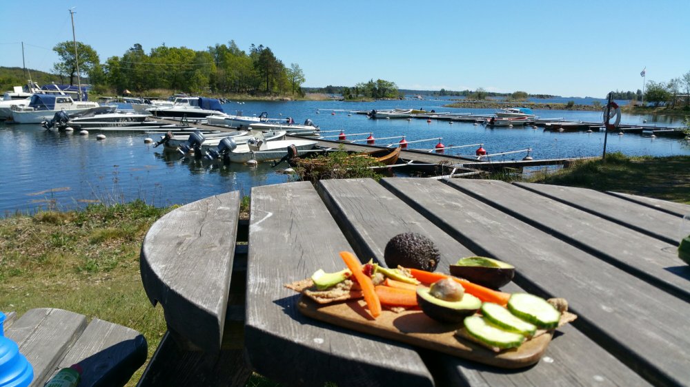 … komme dann wieder zur Küste nach Figeholm, ein fein rausgeputzter Ort mit tollen Häusern, von denen sich ein phantastischer Blick auf die Schärenküste bietet. Hier lädt mich der Sitzplatz am Bootshafen zu einem Picknick ein…