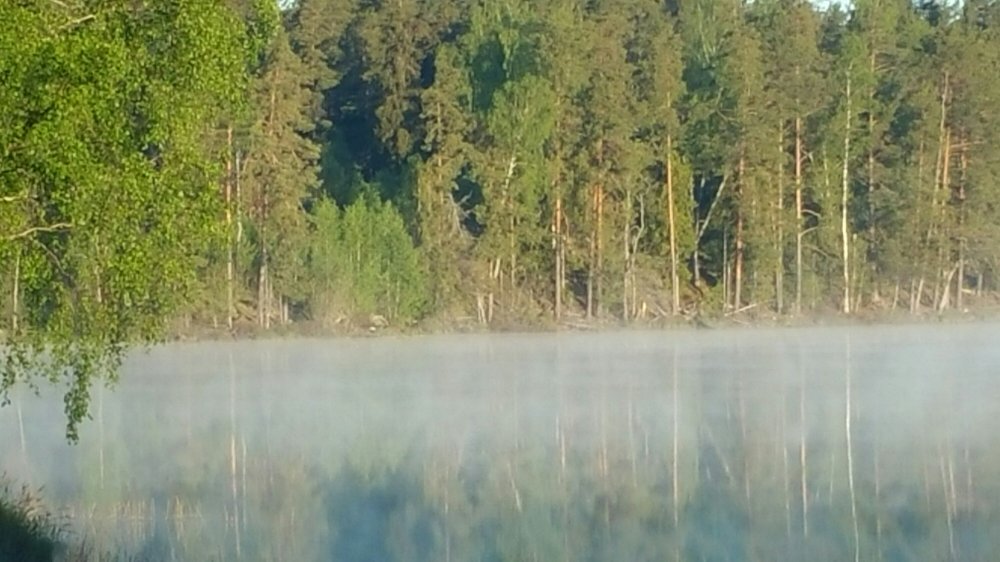 Der morgendliche Blick aus dem Zelt nach einer wunderbar ruhigen Nacht auf den ‚dampfenden‘ See…