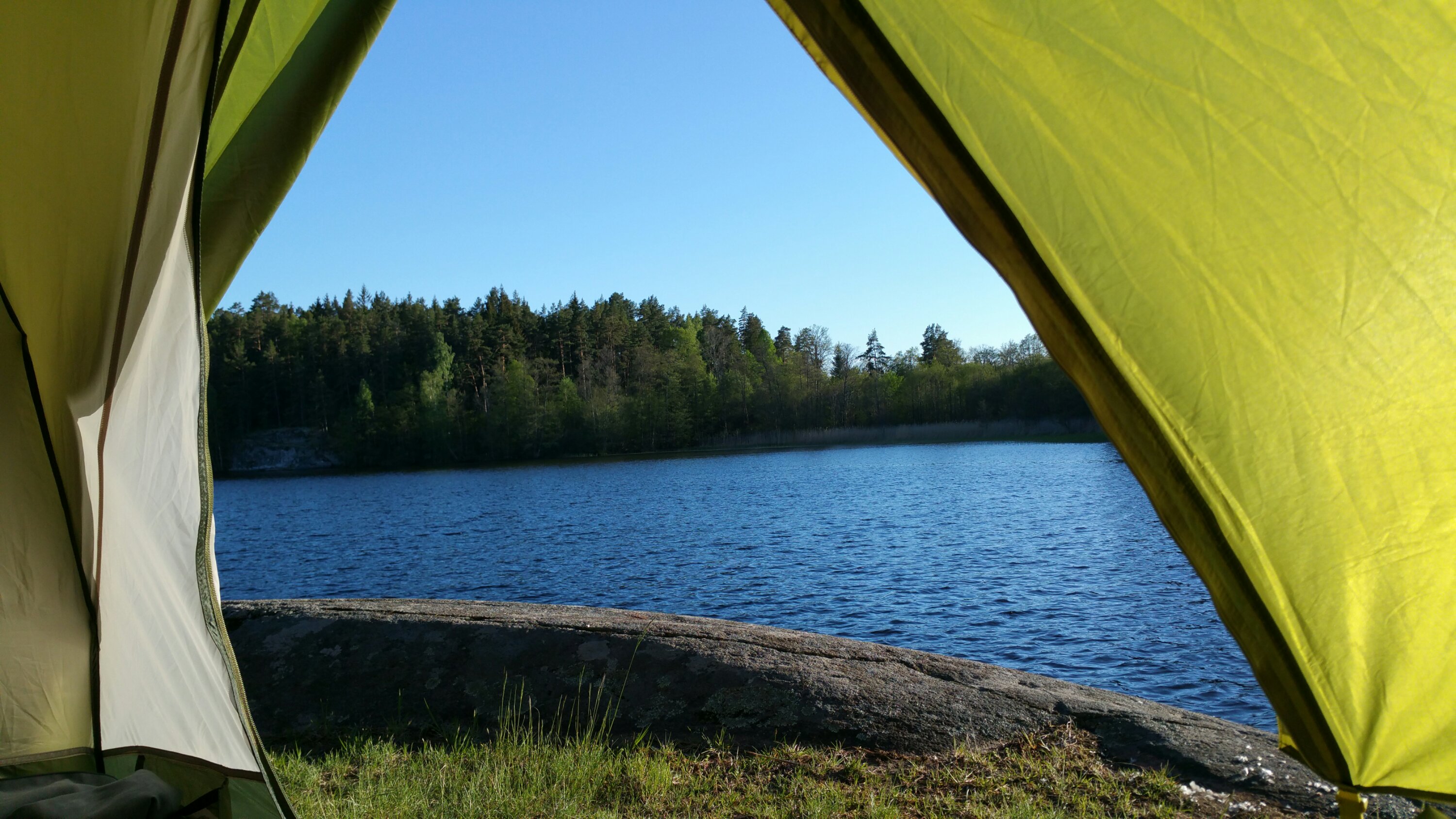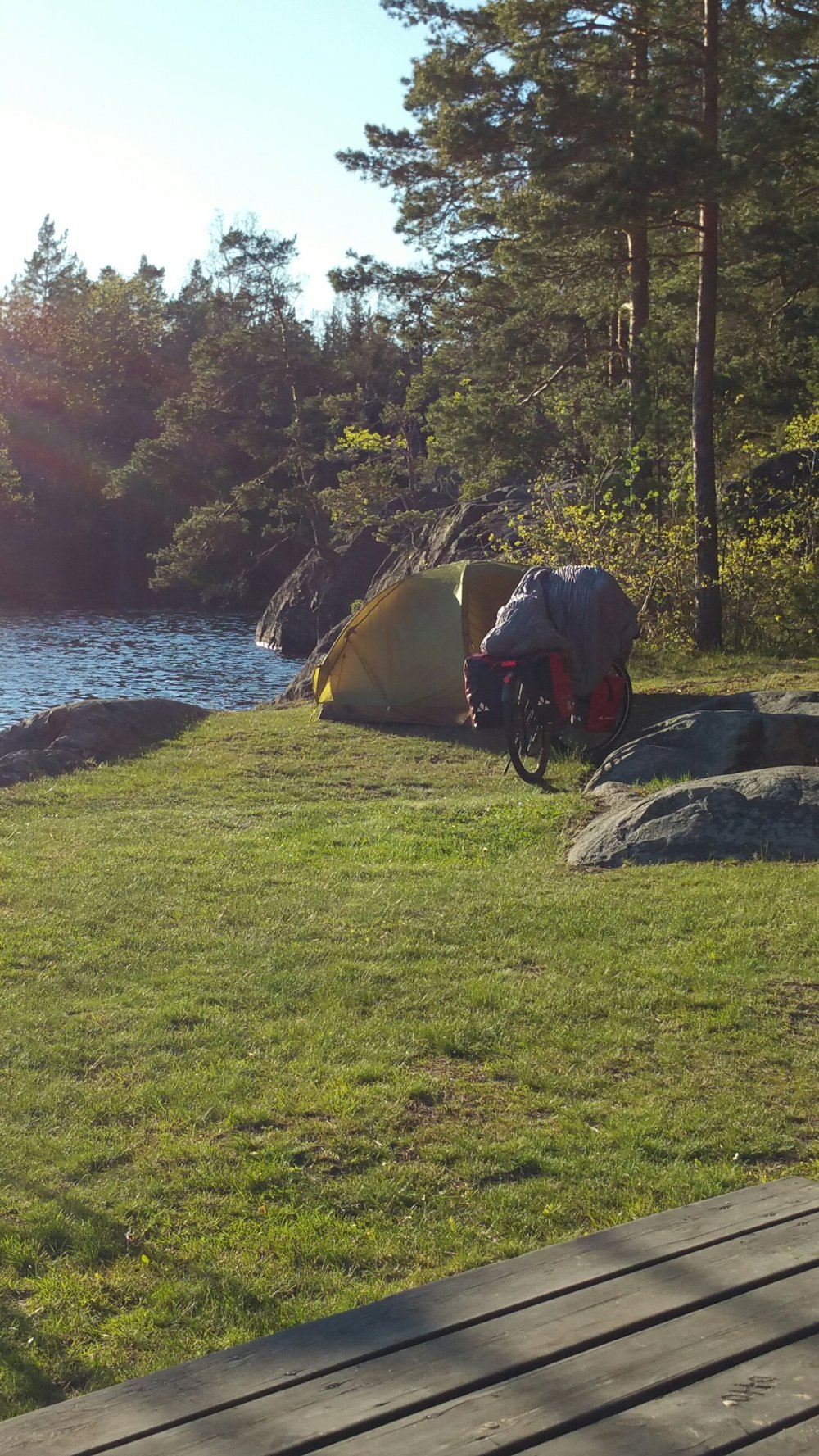 Ich schlafe wunderbar bei geöffnetem Vorzelt und nur durch ein Gazefenster vom See getrennt. Nachts werde ich ab und zu wach, weil irgendwo ein Käuzchen ruft und der Ruf des Prachttauchers über den See schallt. Glücklich und geborgen drehe ich mich auf die andere Seite…