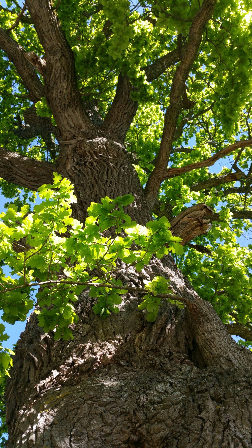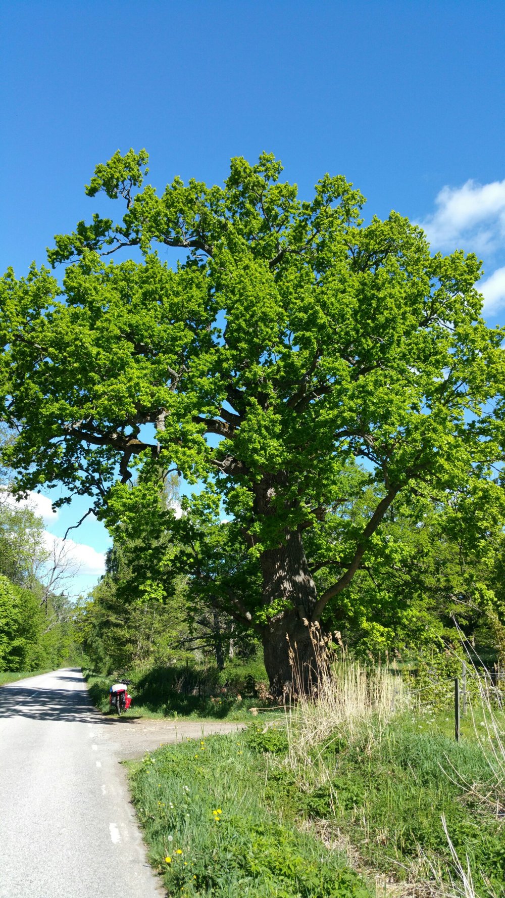 Ich fahre wieder eine sehr schöne einsame Straße und passiere herrliche uralte Eichen. Diese hier hat einen Stammdurchmesser von 2,50 – 3 m! Was diese Eiche schon alles erlebt hat und wie alt sie wohl ist?
