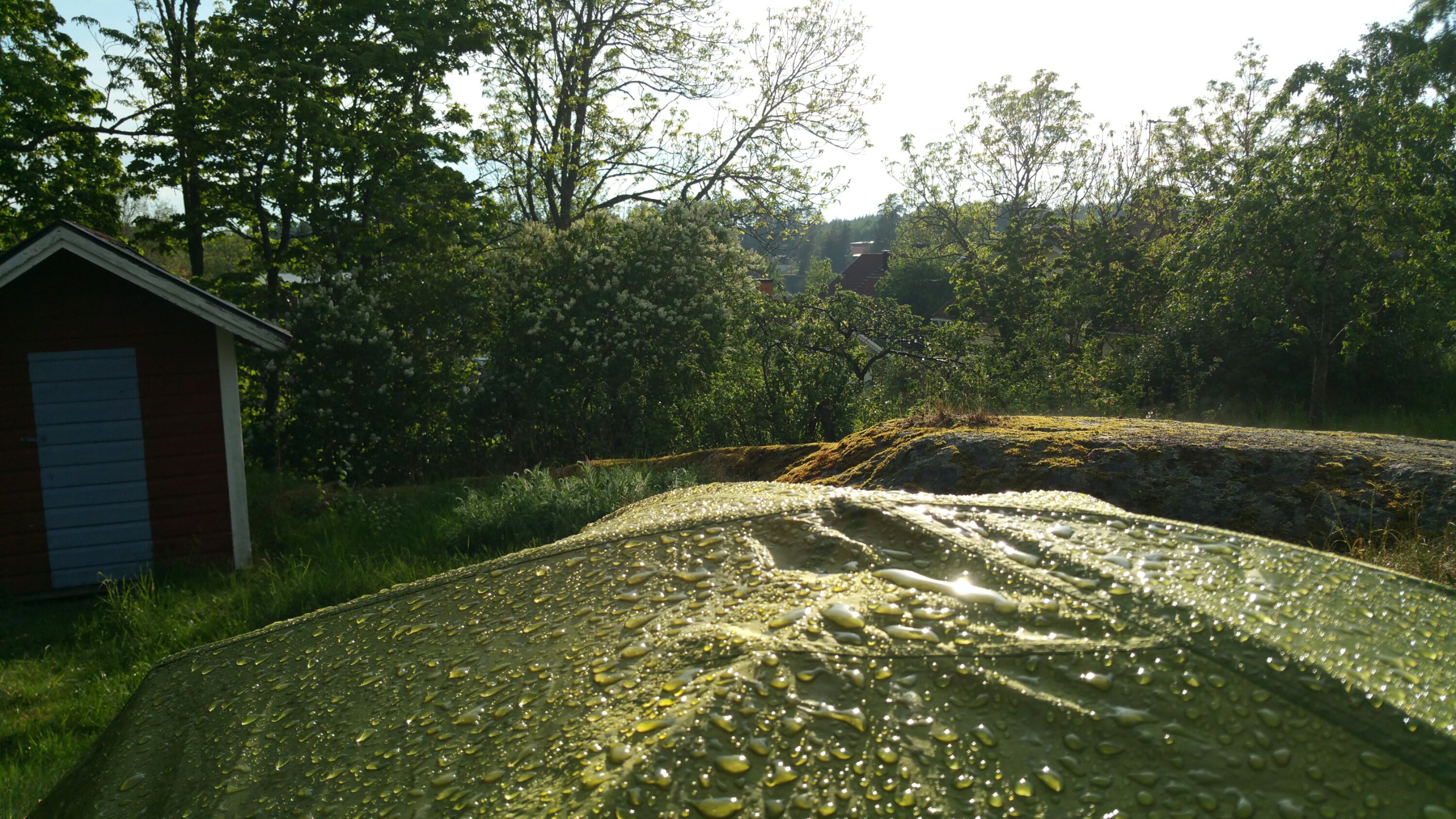 Heute früh wache ich um 5.30 nach einer herrlich ruhigen Nacht natürlich wieder bei Vogelgezwitscher auf. Als ich mich aus dem Zelt gerobbt habe – wie bequem doch so ein Wohnwagenbett ist 🙂 – stehe ich auf einer ziemlich feuchten Wiese, denn das Gras hier ist deutlich höher als in den schwedischen Vorgärten! Nachdem meine verschlafenen Augen allmählich einen klaren Blick zulassen, wird mir klar, dass ich mein Zelt auf einer mit Kuhmist ziemlich frisch gedüngten Wiese aufgestellt habe. Als es gestern Abend so heiß und trocken war, ist diese Beobachtung nicht in mein Bewusstsein vorgedrungen. Vielleicht war ich auch schon zu müde. Jetzt aber, wo die Wiese schön nass ist…