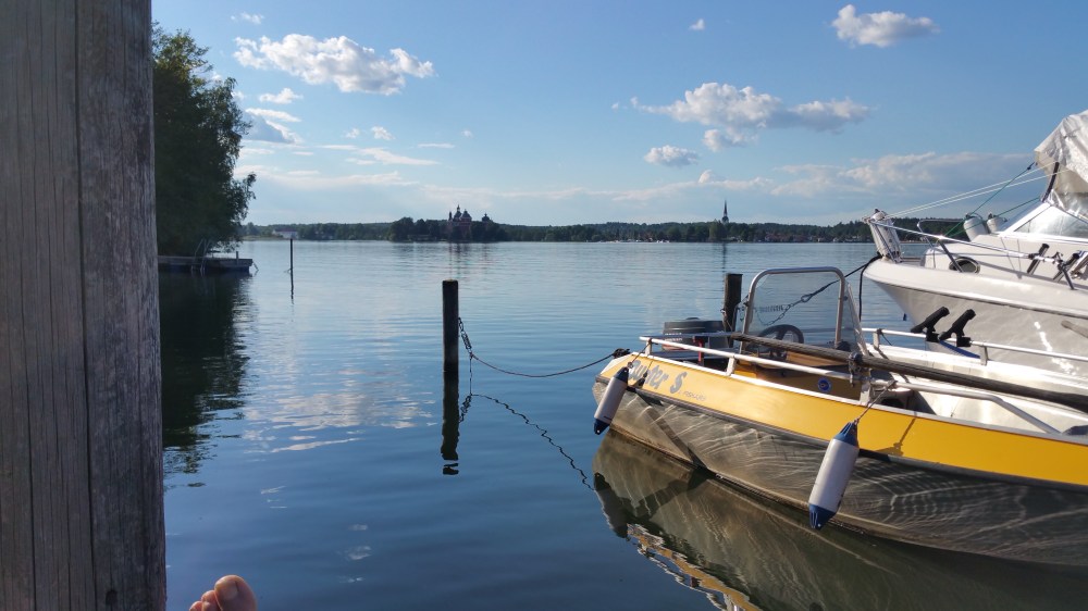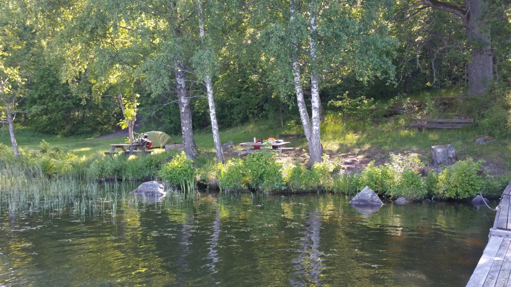 Das Zelt steht also, gegessen und gebadet habe ich auch, und nun sitze ich auf dem Bootssteg in der Abendsonne, um noch ein paar Zeilen zu schreiben…