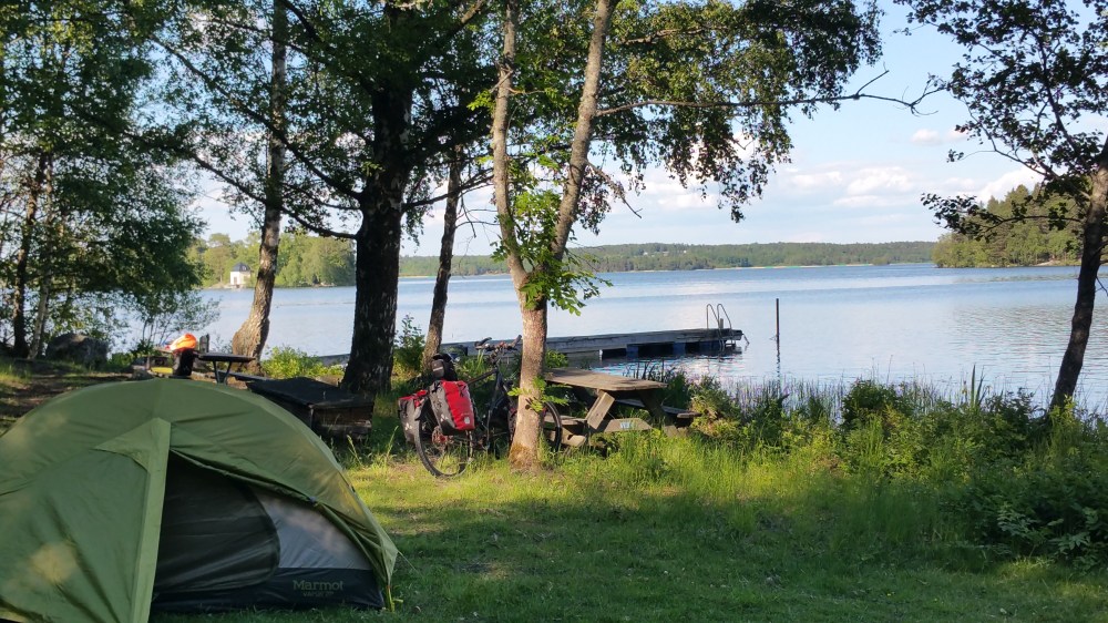 Da ich nun nicht mehr an der Küste entlang fahre, werde ich versuchen, an Badestellen zu zelten. So kann ich morgens und abends ein Bad nehmen und meistens sind auch ein Tisch und eine Bank vorhanden…Wenn ich an einer Stelle ankomme, baue ich als erstes immer gleich das Zelt auf und esse anschließend  in Ruhe. Da die Mücken meistens erst am Abend aufdringlich werden, kann ich mich dann bei Bedarf schnell ins Zelt zurückziehen.