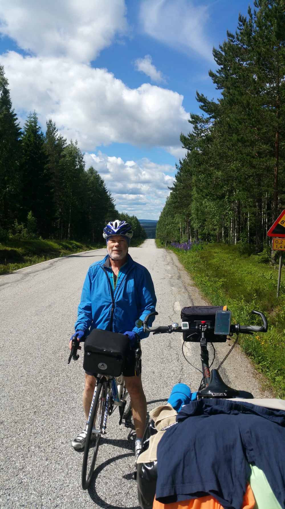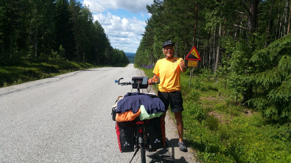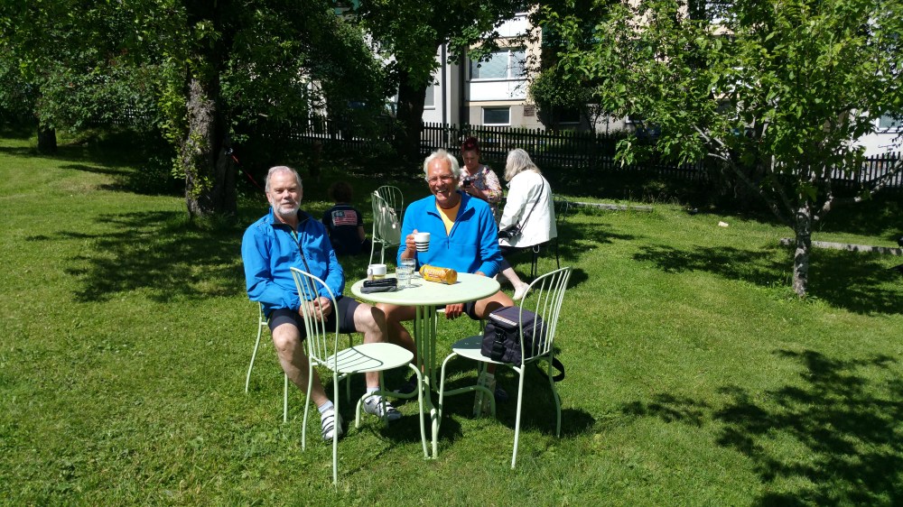 Mitten auf der Straße entwickelt sich ein sehr angenehmes Gespräch, wir fotografieren uns gegenseitig vor einer rasanten Abfahrt – Höchstgeschwindigkeit 58 km/h. Unterwegs entschließen wir uns zusammen ins 10 km entfernte Nora zu fahren. Wir legen im hübsch gelegenen Nora eine ausgiebige Kaffeepause ein, unterhalten uns sehr angeregt ….