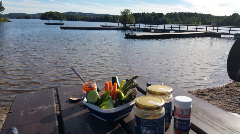 Mein Abendbrot am See ist wieder köstlich und an einem komfortablen Tisch direkt am kleinen Badestrand …