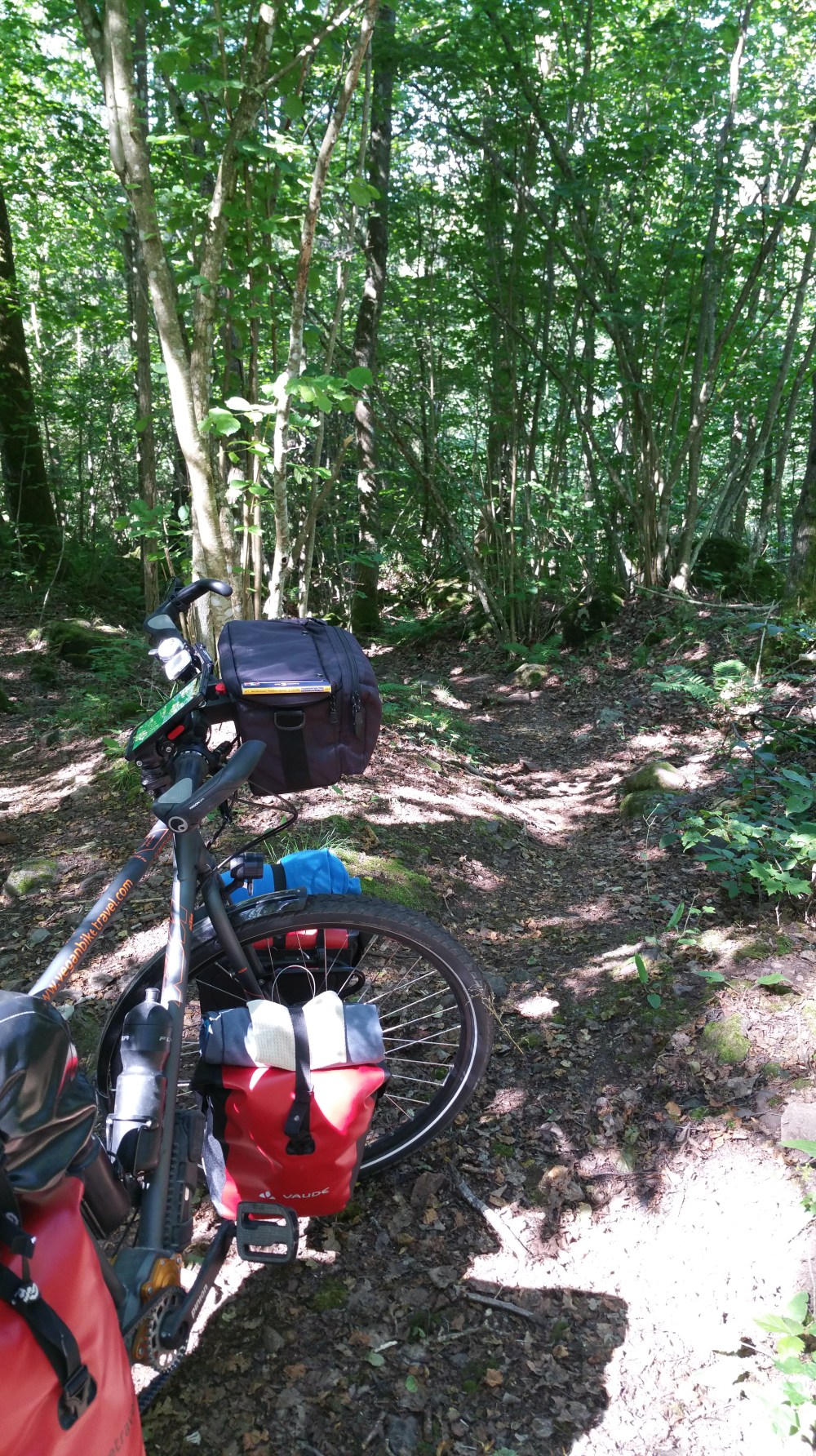 Ich habe meine Navigation nicht richtig eingestellt und lande auf einem schmalen Pfad im Wald. Das ist mir jedoch nicht gleich klar, weil ich immer mal wieder auf interessante Abkürzungen geschickt wurde. Diesmal ist es anders. Es geht immer bergab, der Pfad wird immer schmaler … und aus einem bisher einigermaßen befahrbaren Pfad wird ein Felssteig, der kaum zu begehen ist.