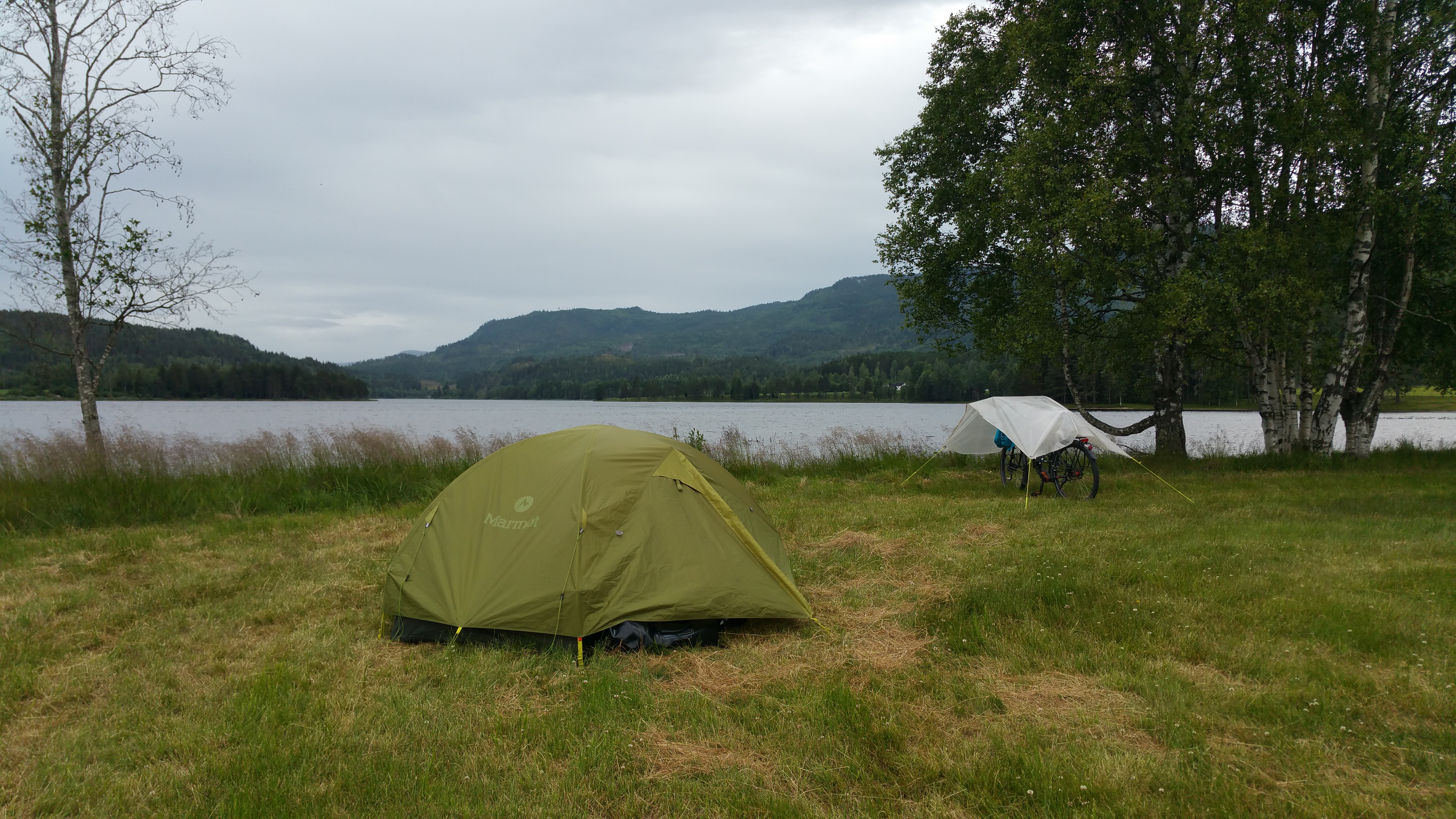 Rune ist total nett und hilfsbereit und erlaubt mir, direkt am Lågen auf seinem Land zu zelten! So bin ich entfernt von Straßen und Hektik doch wieder an meinem geliebten Platz in der ersten Reihe am Wasser!