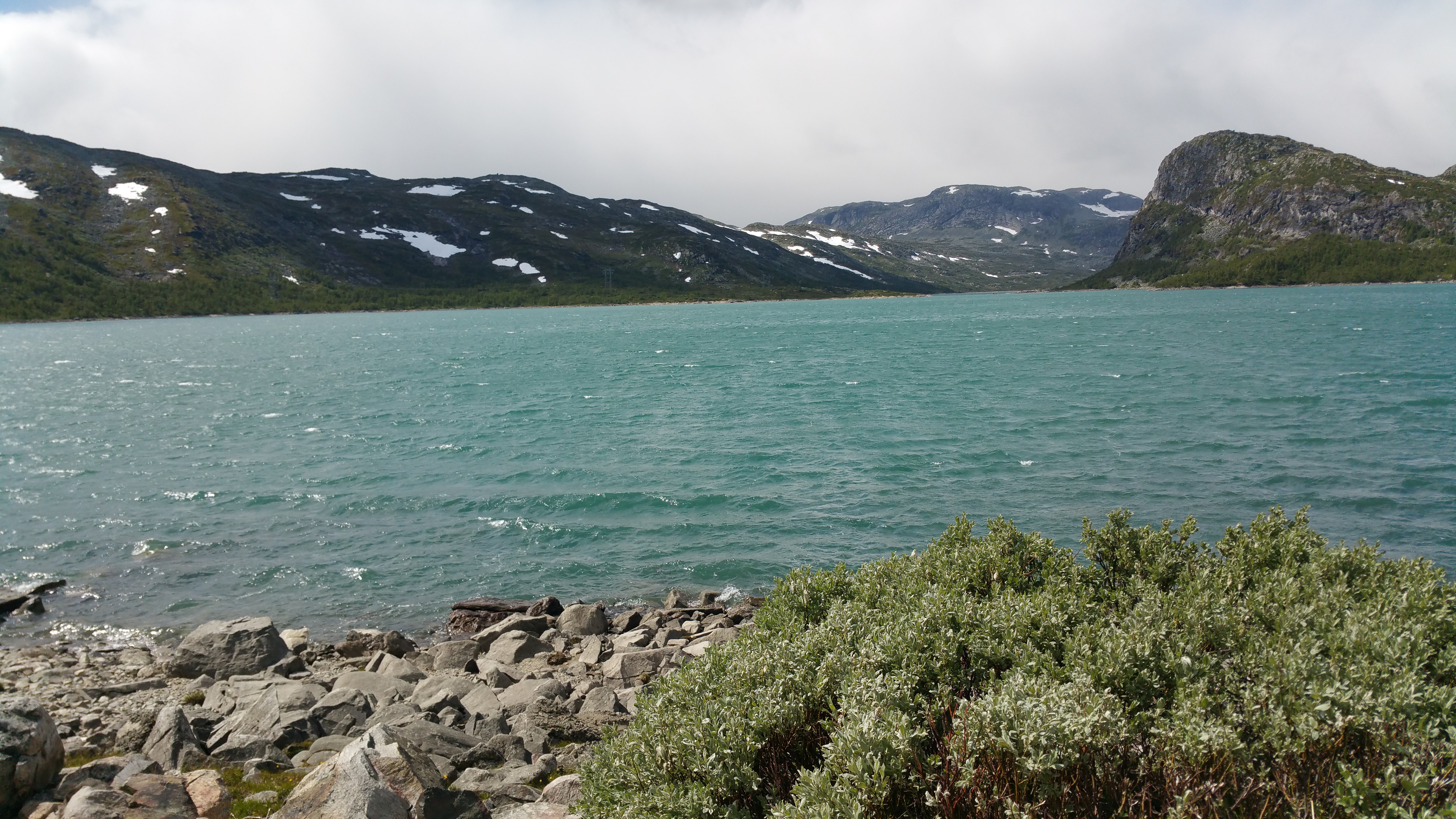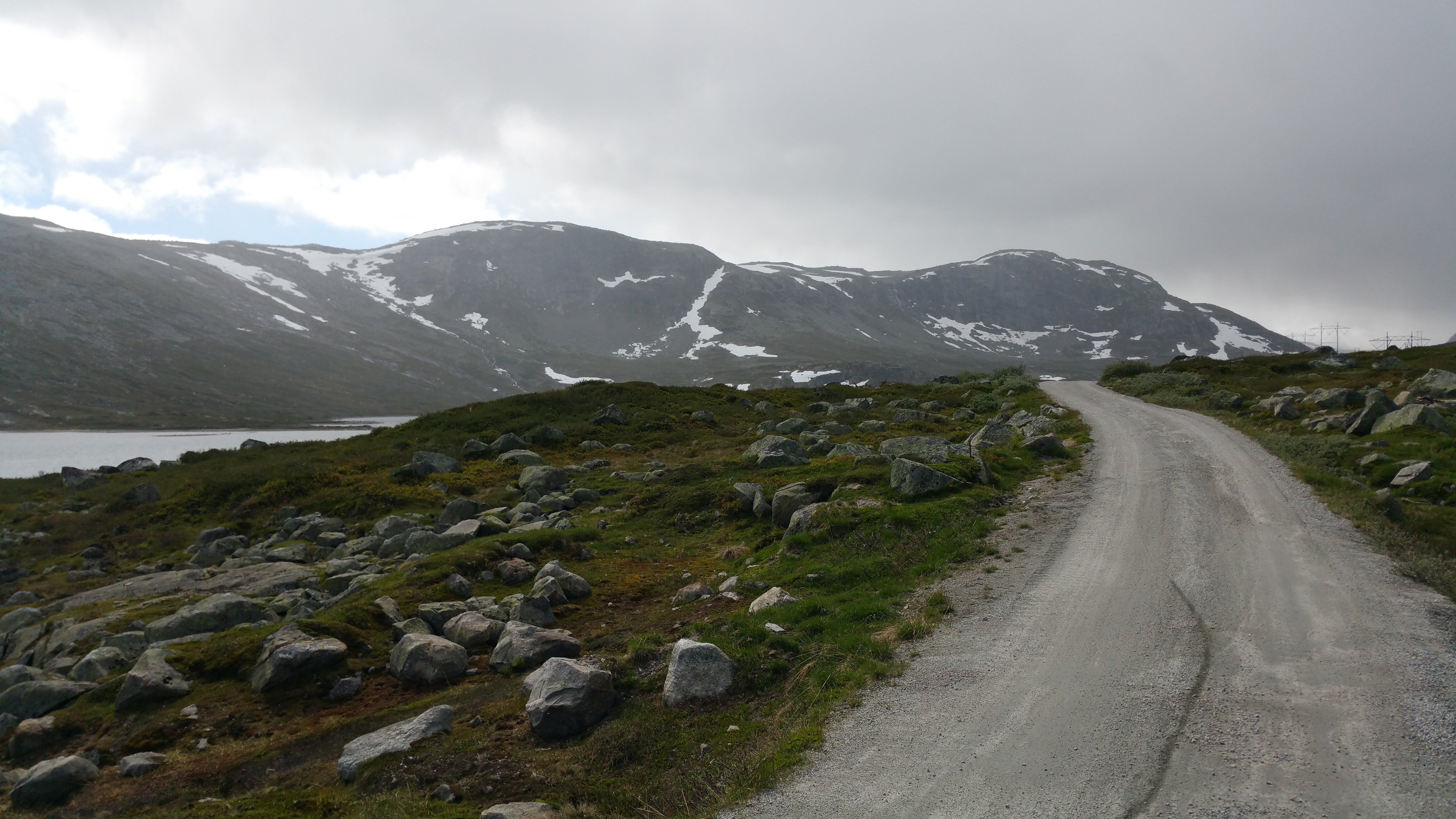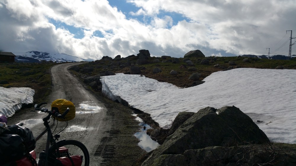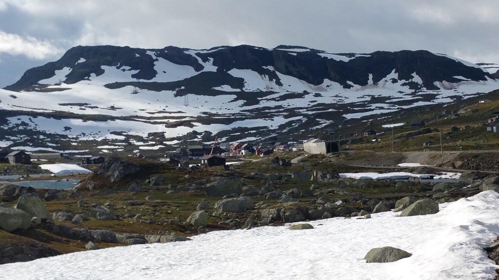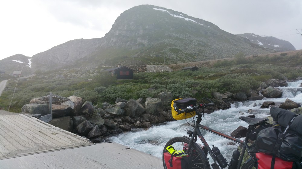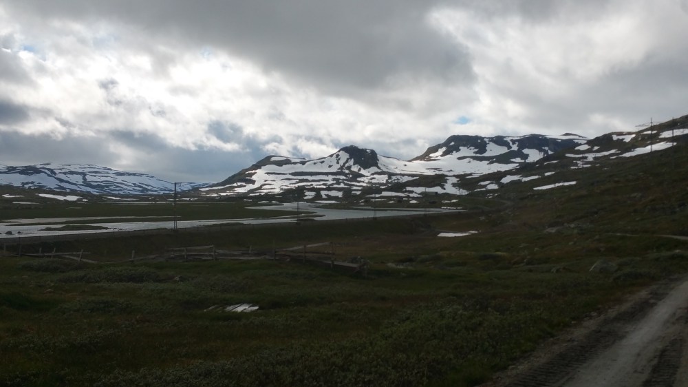 Ohne Regen hätte ich es sicher irgendwo getan, so aber entschließe ich mich, nach Finse durchzufahren, in der Hoffnung, dort irgendwo einen geschützten Schlafplatz zu finden …