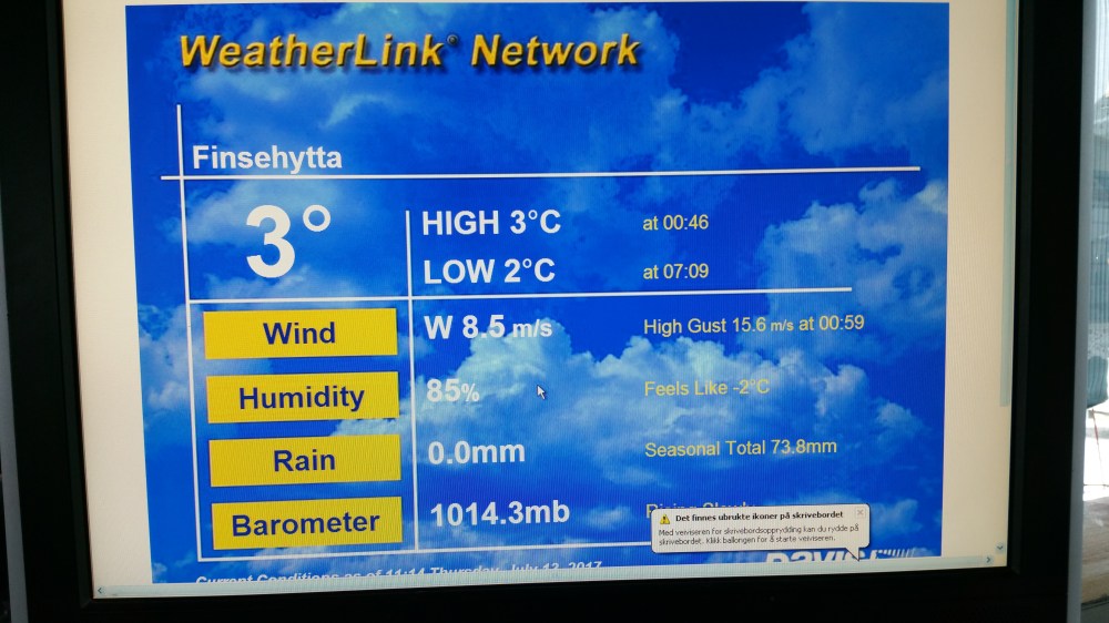 Der Blick am nächsten Morgen auf die Wetterstation zeigt zwar etwas freundlicheres Wetter an, aber es ist nach wie vor recht windig und ziemlich kühl …