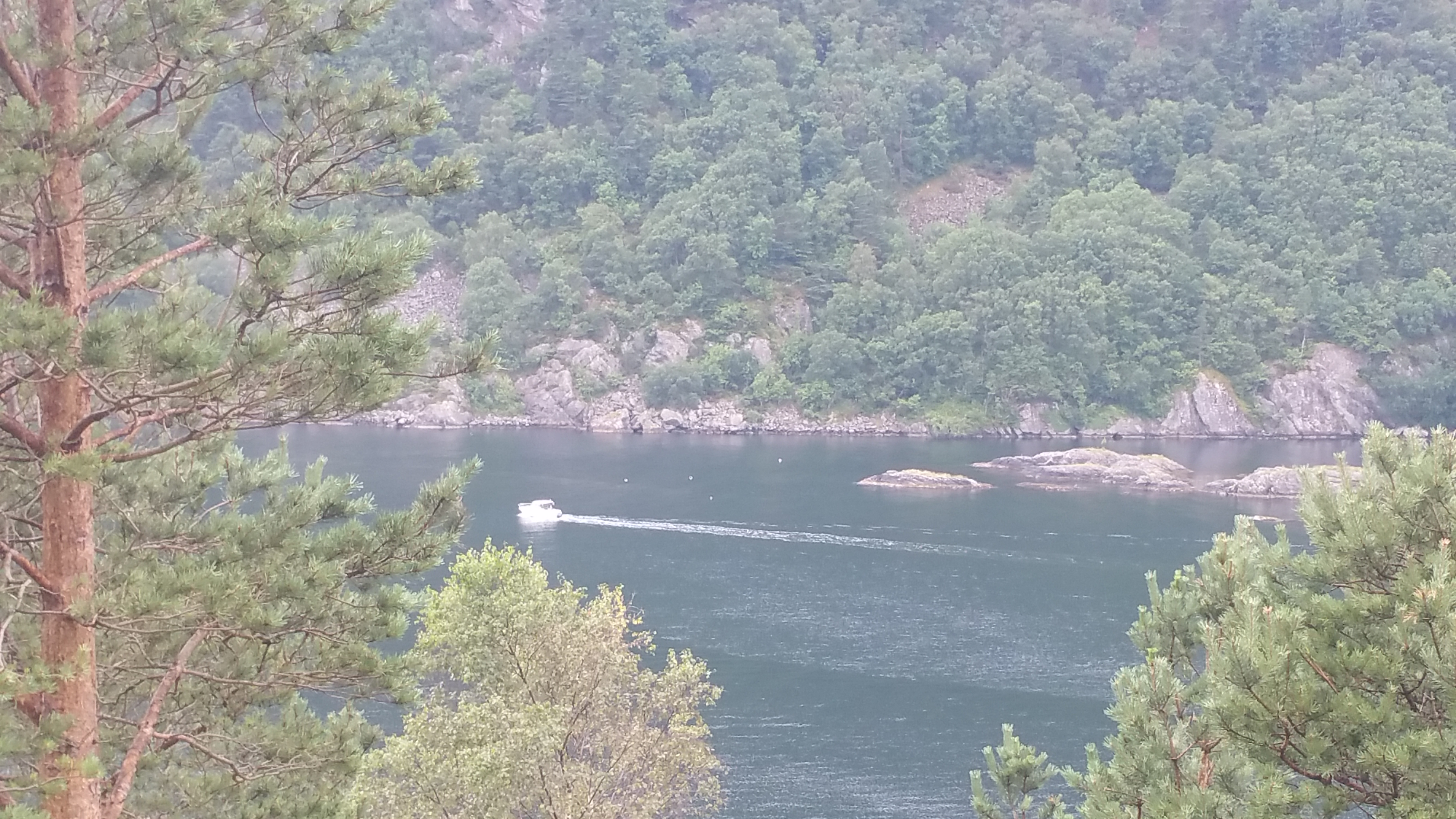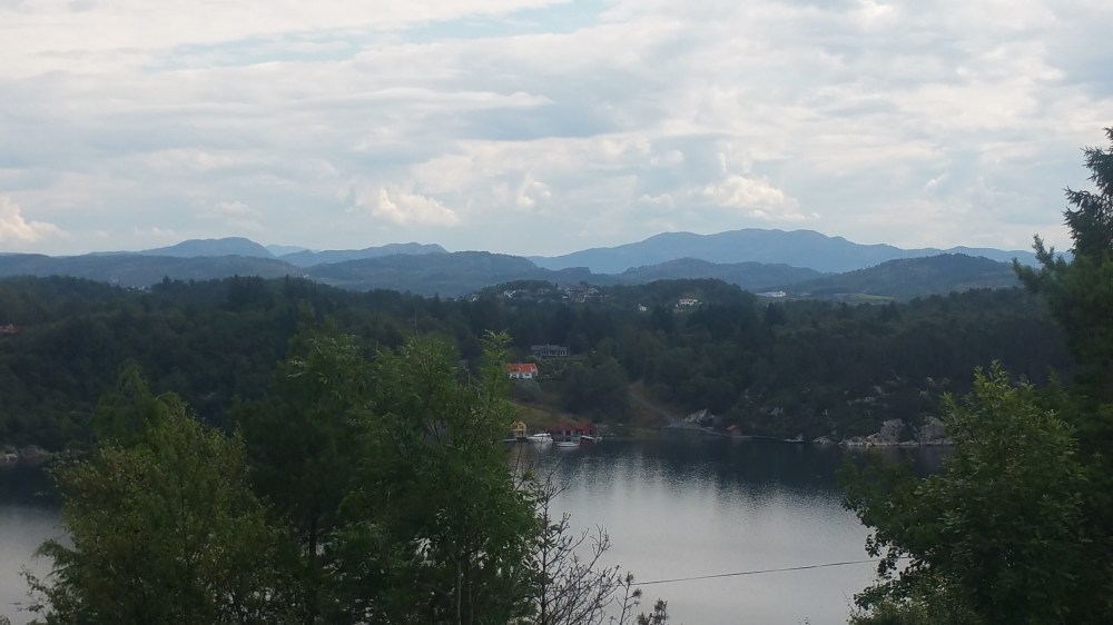 Heute früh (Dienstag, 25.7.) ist das Wetter wieder prächtig! Um 11 Uhr sind bereits 19°. die Sonne scheint und ich sitze auf der Terrasse eines Cafės mit schönem Blick auf den Fjord.