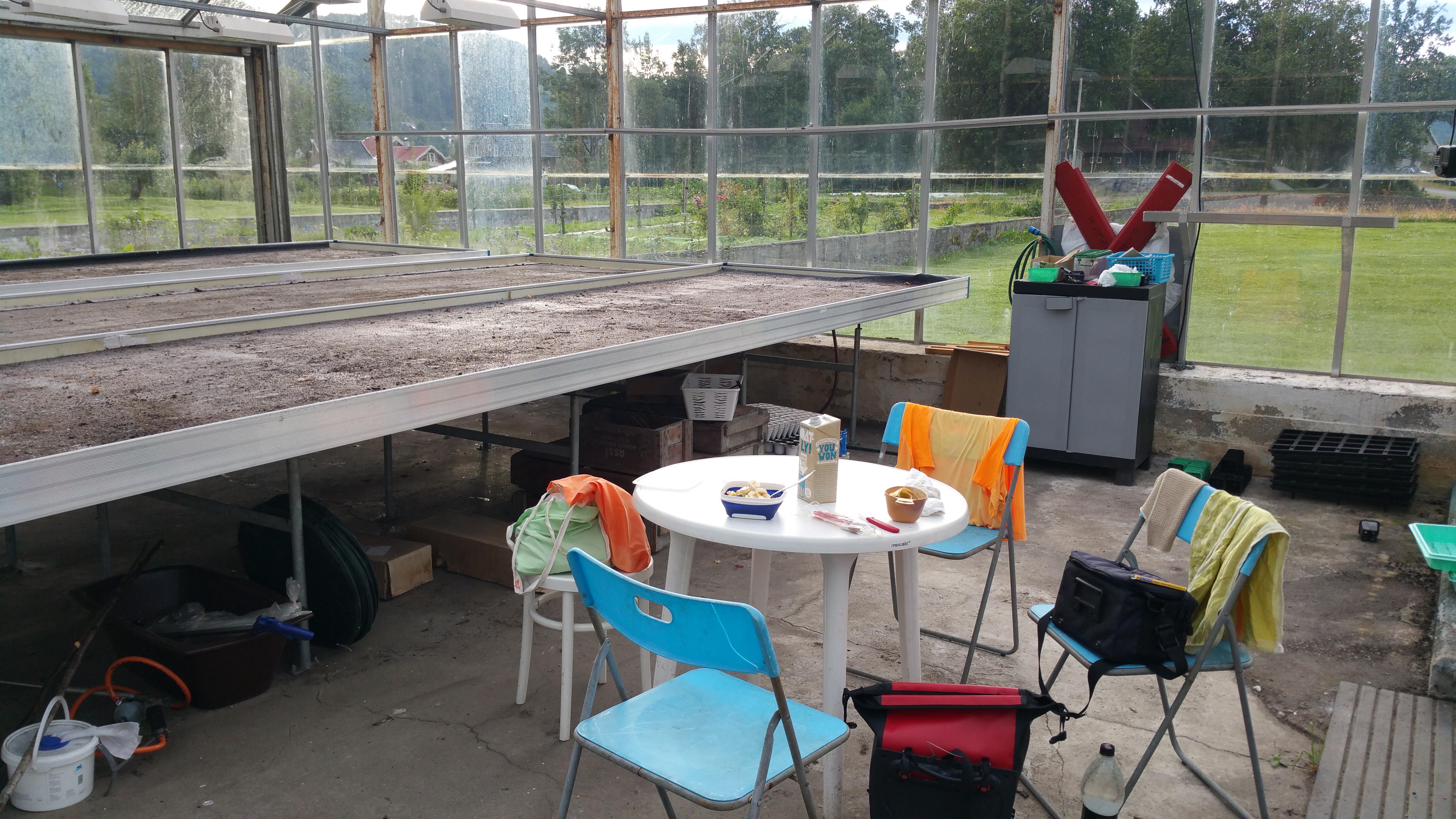 Der Garten wird von einer Verbrauchergemeinschaft betrieben und ich darf sogar ein wenig vom Obst naschen (Himbeeren, Erdbeeren und schwarze Johannisbeeren). Im Gewächshaus steht mir ein warmer Sitzplatz zur Verfügung, es gibt natürlich frisches Wasser und eine Toilette ist auch da. Alles, was mein Camperherz begehrt!