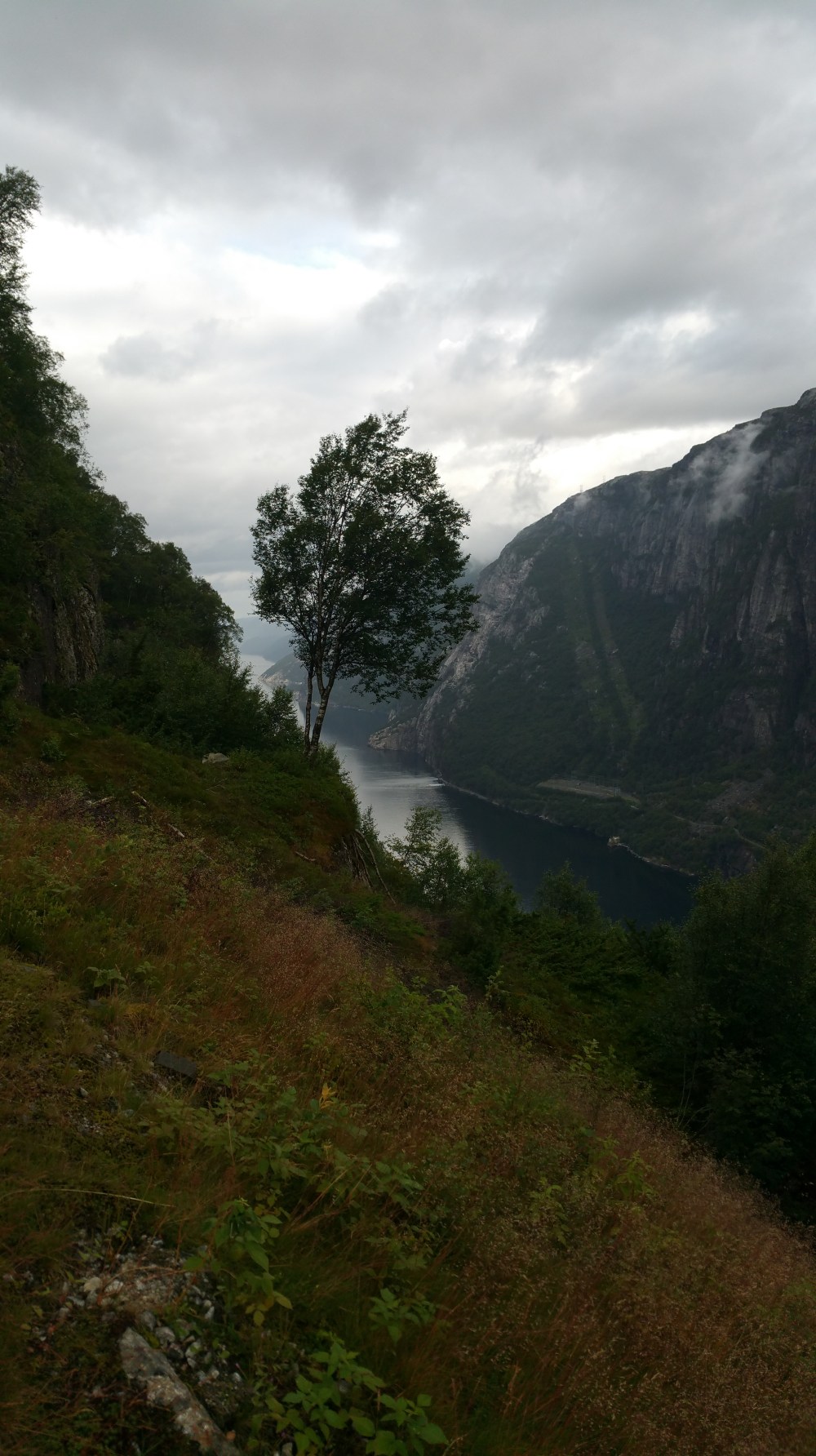 Ganz langsam schraube ich mich hoch, lege immer mal wieder kleine Verschnaufspausen ein, genieße den Blick auf den Fjord und die umliegenden Berge …