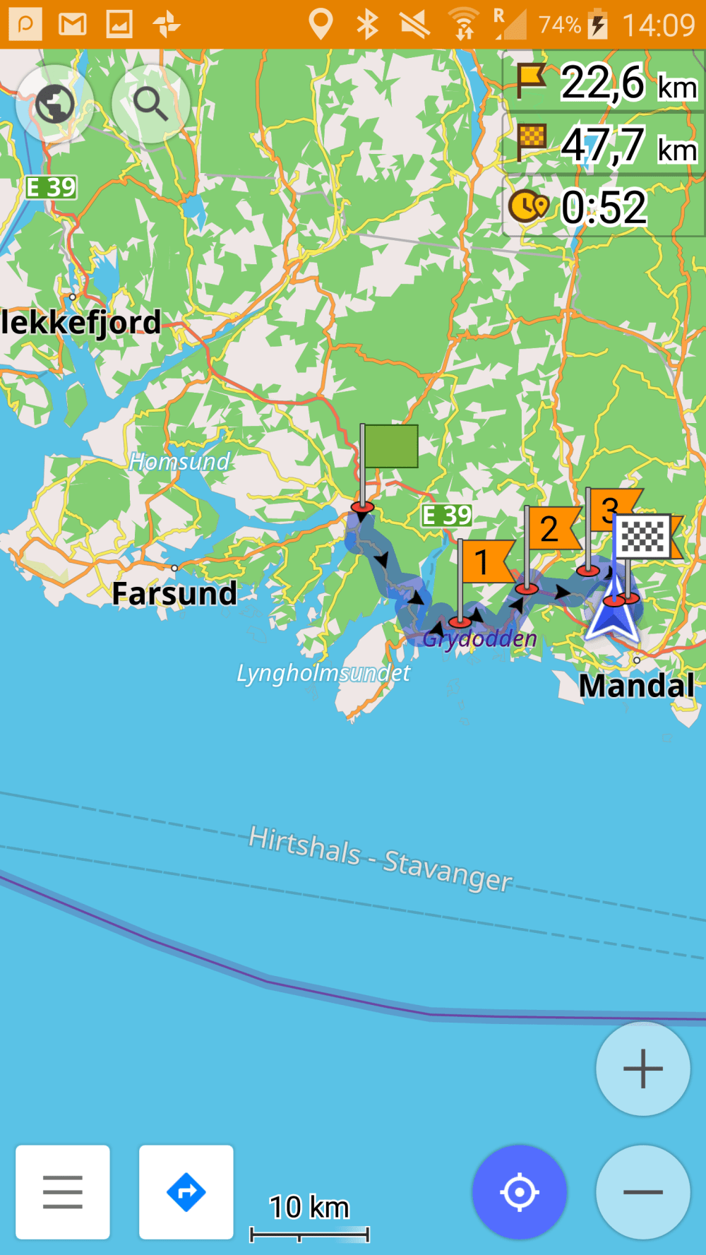 Ich starte nach dem Regenguss, fahre zur Tankstelle um den Reifendruck zu kontrollieren und trete dann die knapp 60 km nach Mandal zu Rune an. Rune wird mein Host in Mandal sein und wir haben uns für den späteren Nachmittag verabredet.