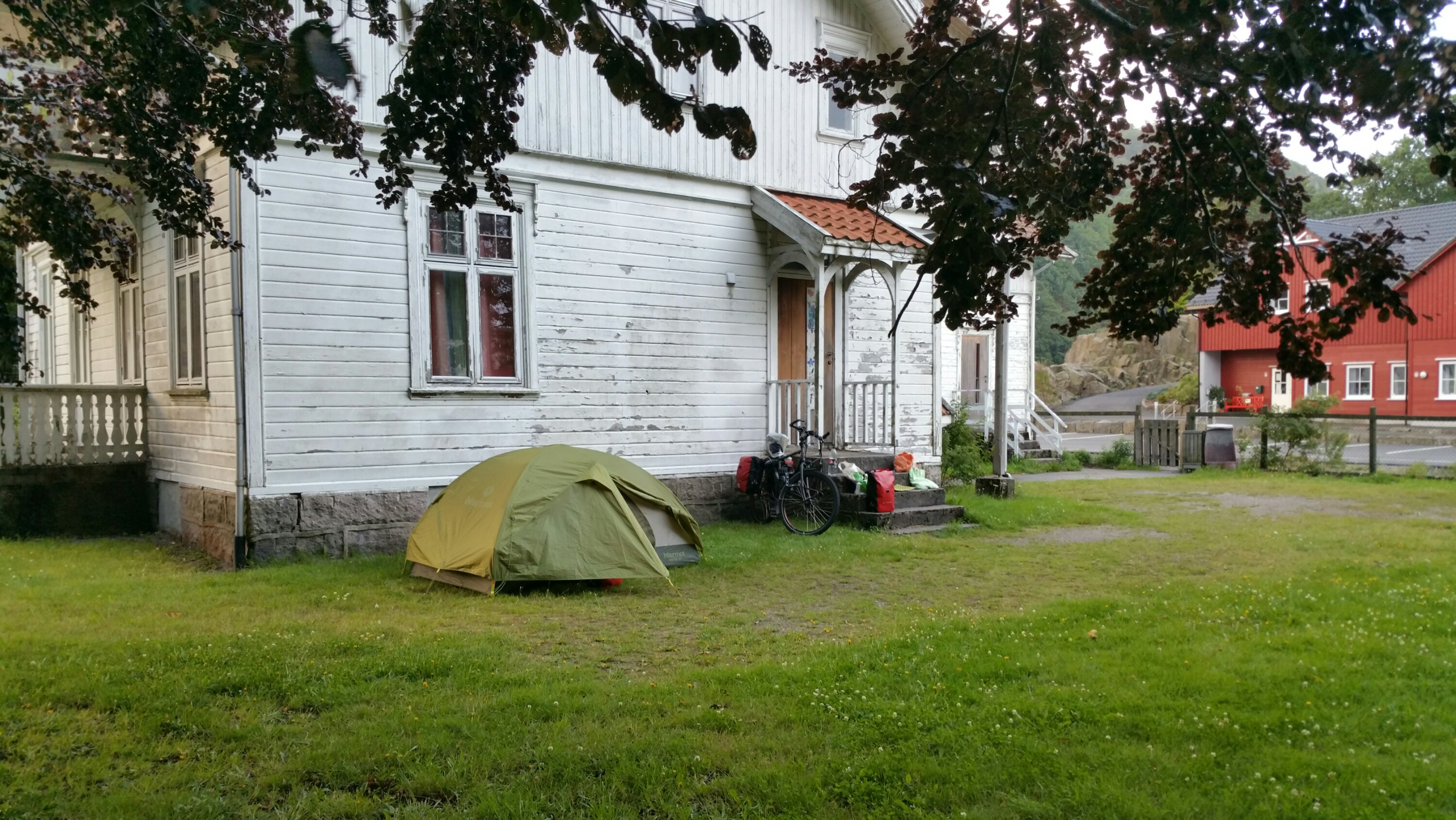 Jetzt zeigt sich die wahre Qualität meines Übernachtungsplatzes! Über der Eingangstür befindet sich ein kleines Vordach, unter das ich mich mit meinen Frühstücksutensilien retten kann.