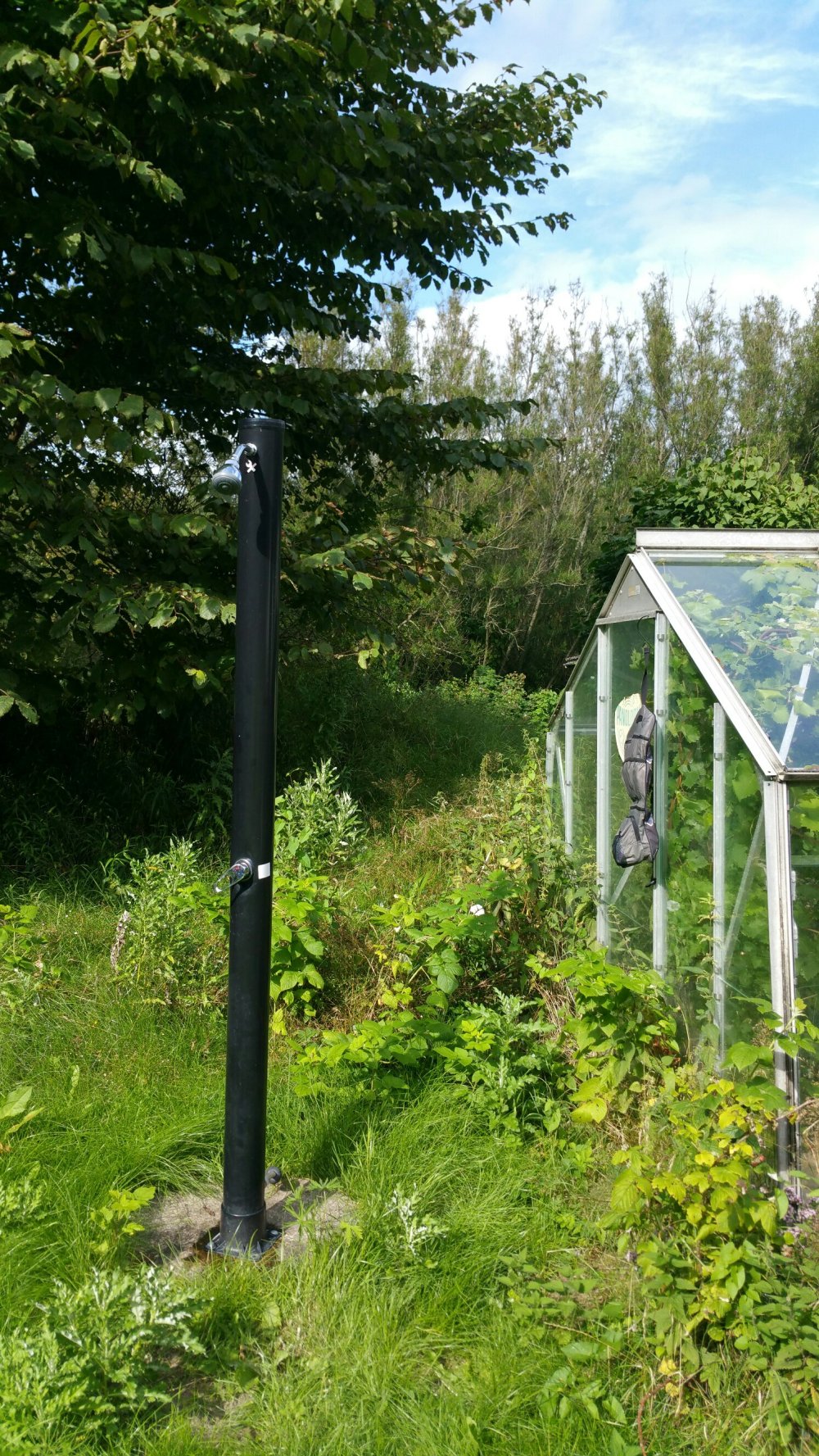 Juan hat eine Solardusche im Garten errichtet und lädt mich ein, sie zu nutzen.