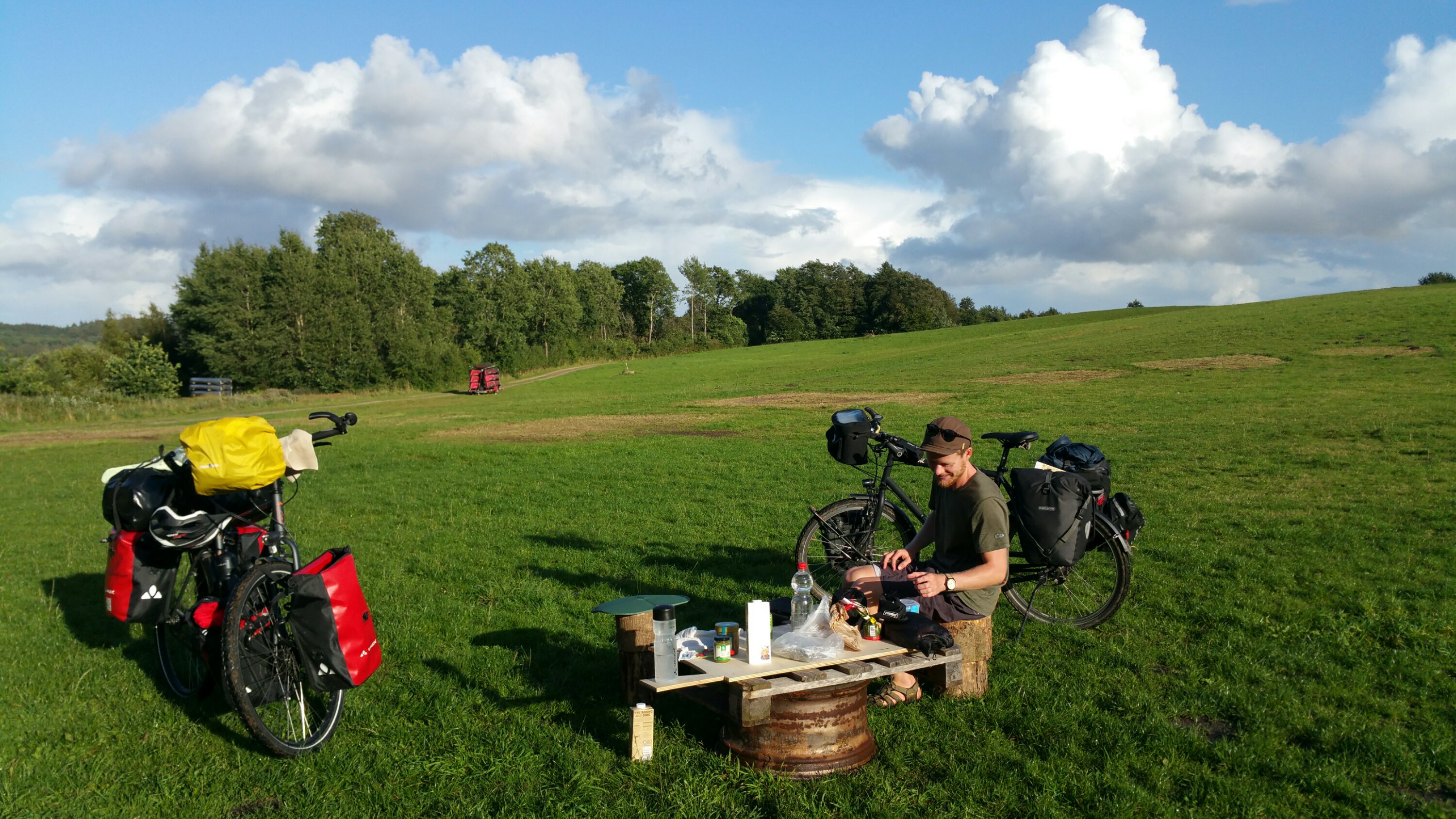 Nach unserer Nacht am Straßenrand genießen wir ein köstliches Frühstück im Pavillon. Natürlich hat Romain einen kleinen Kocher dabei – obwohl er nur 12 kg Gepäck transportiert – und so gibt es heißen Kaffee zum Frühstück!
